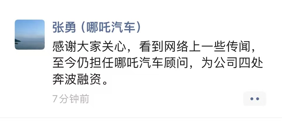 4月14日,哪吒汽车原CEO张勇在朋友圈回应前往英国的传言称:“感谢大家关心,看到网络上一些传闻,至今仍担任哪吒汽车顾问,为公司四处奔波融资。”