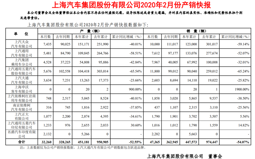 3月6日,上汽集团公布了2月份产销快报。快报显示,2月份,上汽集团旗下乘用车和商用车两大板块单月产量为3.2万台,同比下跌90.2%;销量为4.7万台,同比跌86.9%。