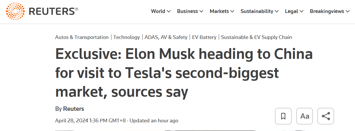 智驾云图讯 据路透社报道,两位知情人士透露,特斯拉首席执行官埃隆·马斯克(Elon Musk)在4月28日(周日)搭乘航班飞往北京,以对特斯拉的第二大市场开启一次惊喜之旅。