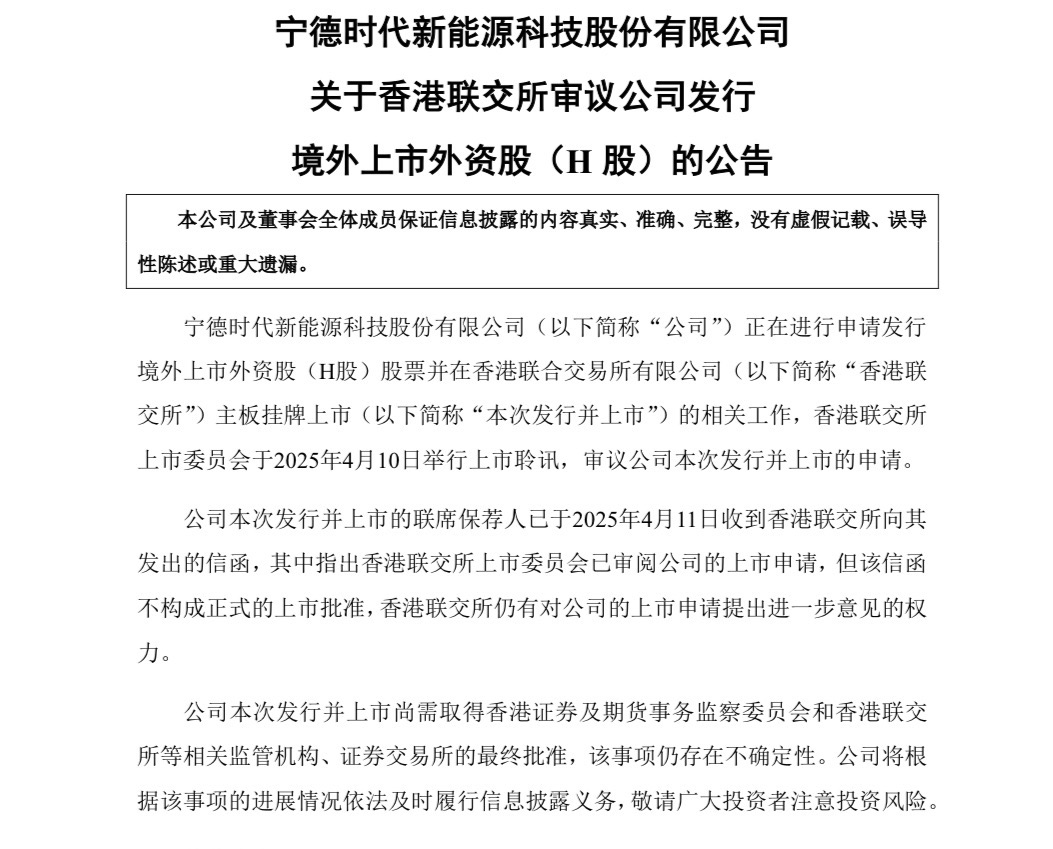 4月11日,宁德时代发布晚间公告表示,香港联交所上市委员会于2025年4月10日举行上市聆讯,审议公司本次发行并上市的申请。公司本次发行并上市的联席保荐人已于2025年4月11日收到香港联交所向其发出的信函,其中指出香港联交所上市委员会已审阅公司的上市申请。