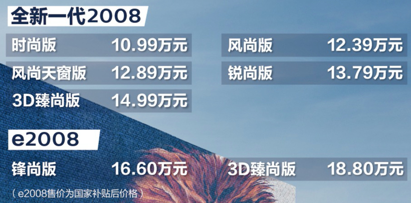 5月20日,东风标致全新一代2008和e2008正式上市,2008搭载1.2T涡轮增压3缸发动机,指导价格为10.99万~14.99万,e2008为电动版售价为16.6万~18.8万。