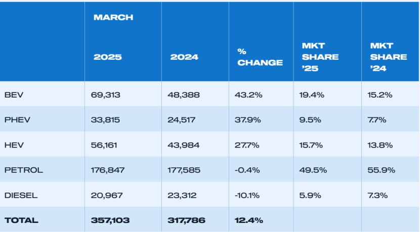 智驾云图讯 英国汽车制造商和贸易商协会(SMMT)的数据显示,今年3月份,英国新车注册量同比增长12.4%至357,103辆,为自2019年(458,054辆)以来的最佳同期销量表现。